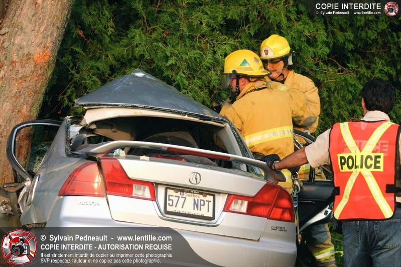 Une voiture a frappé un arbre de plein fouet, ne laissant aucune chance à son conducteur. Les pompiers de St-Pie et l'équipe de sauvetage du service incendie de Saint-Hyacinthe ont effectué la désincarcération.