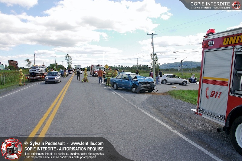 Les pompiers de St-Pie, les premiers répondants de St-Pie, l'unité de désincarcération de Saint-Hyacinthe, les paramédics de Saint-Hyacinthe et les policiers de la Sûreté du Québec ont été dépêchés devant Sanair pour un accident majeur impliquant possiblement 5 véhicules. Une fois les premiers véhicules 10-17, l'incident a été confirmé relativement mineur.