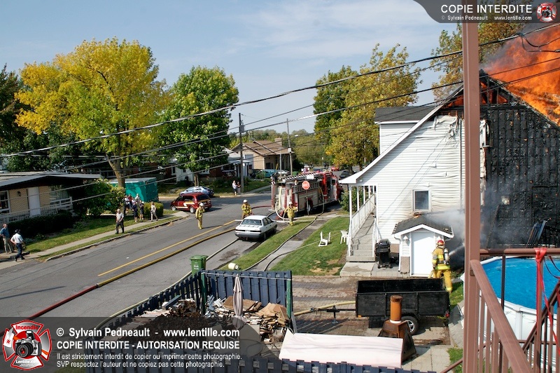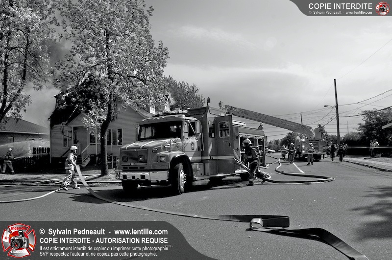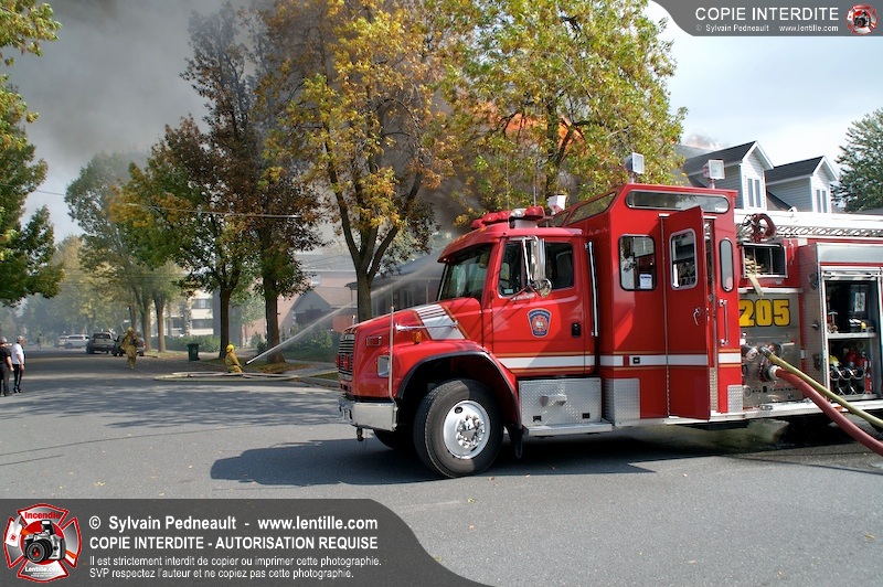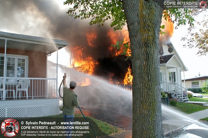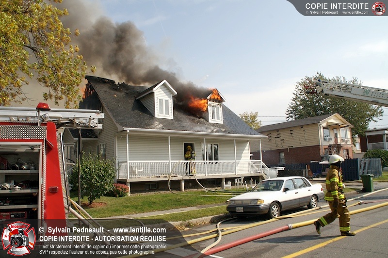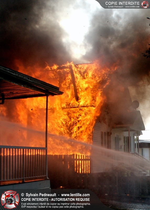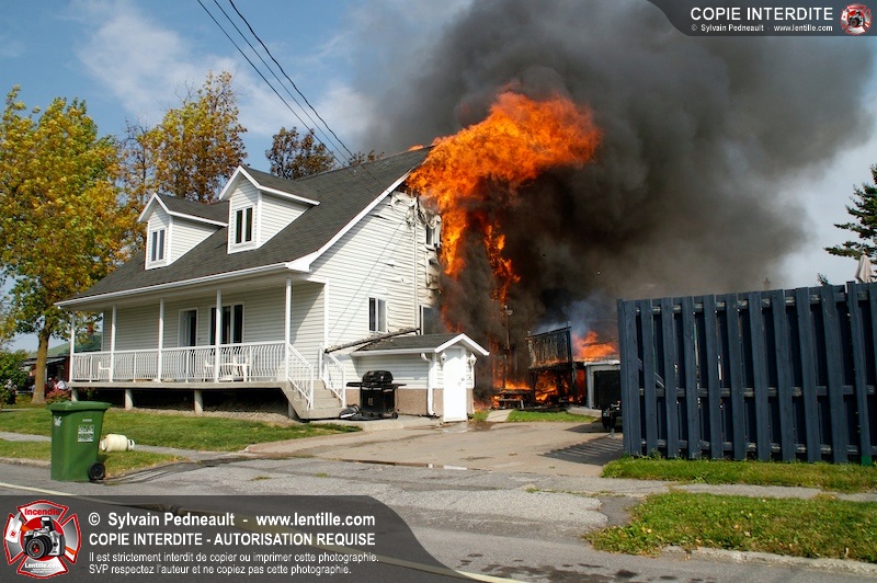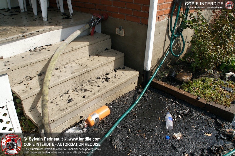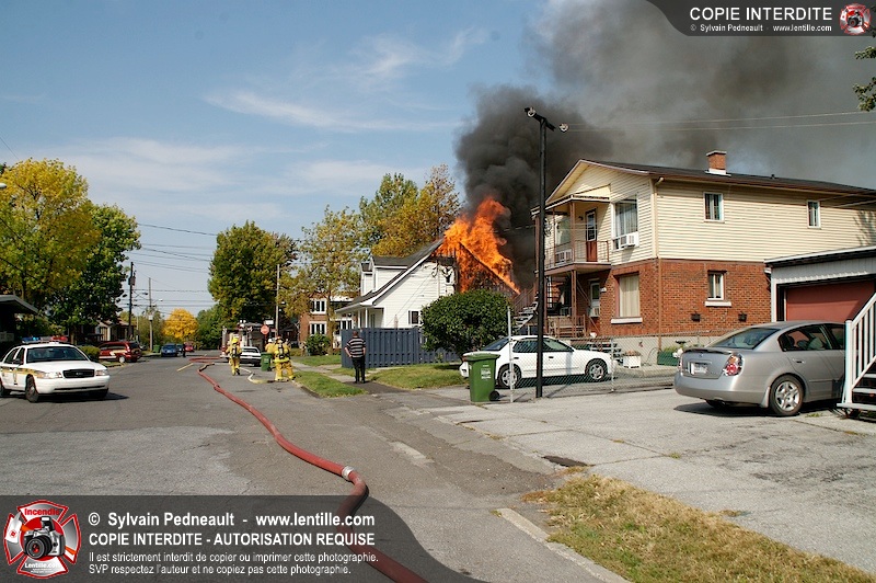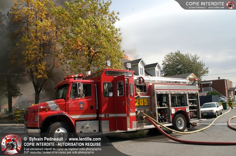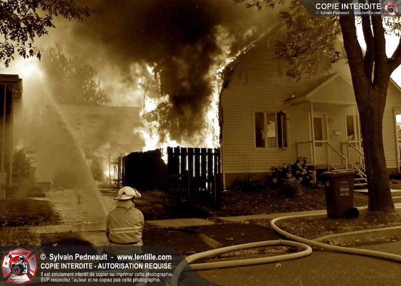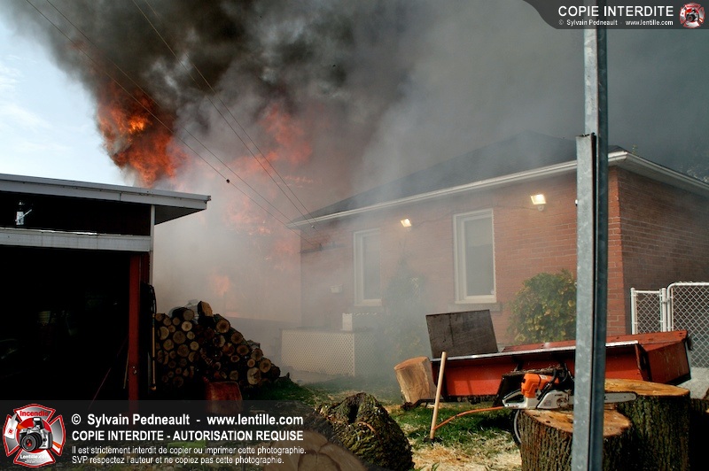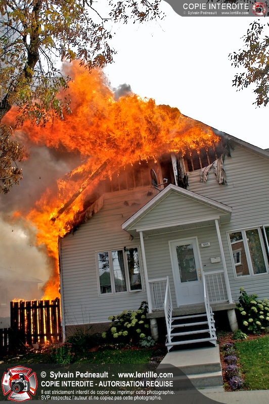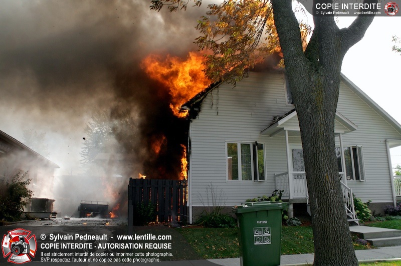 Dès la réception de l'appel pour un feu de résidence, des officiers ont rapporté voir une épaisse colonne de fumée noire dans le ciel, déclarant ainsi l'appel comme fondé. 10-07, 10-12 et 10-13 se sont rapidement succédés étant donné les risques très élevés de propagation à deux bâtiments habités et un garage. Une des maisons était tellement menacée par le brasier que le tout premier jet installé par le 205 fut un jet de protection.