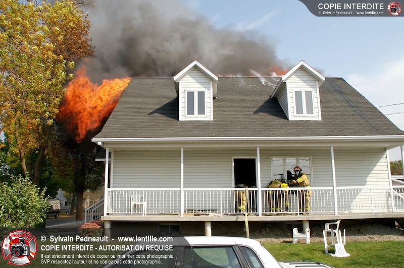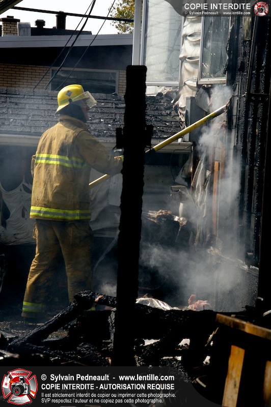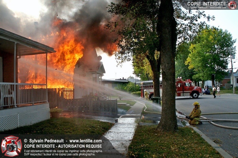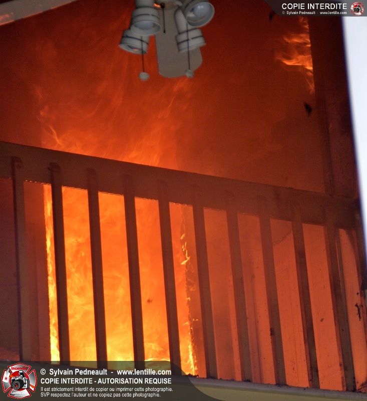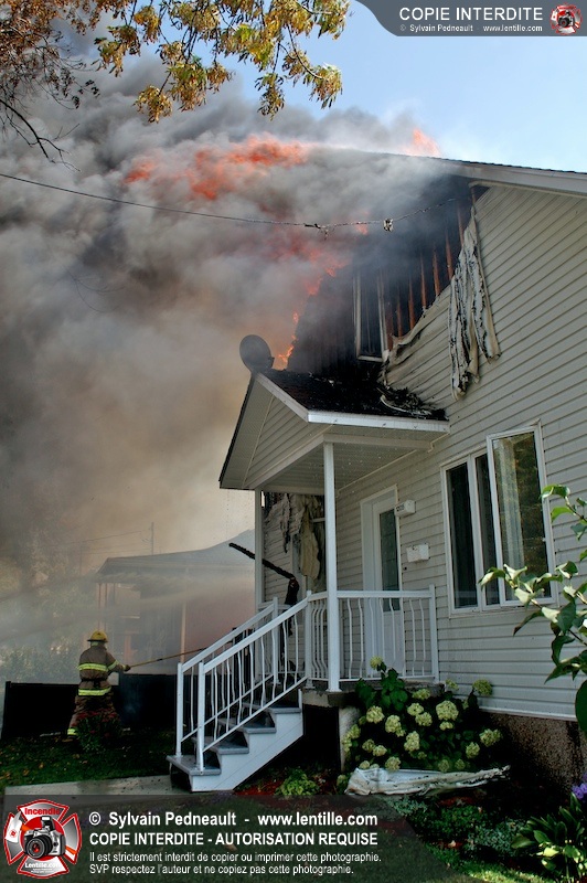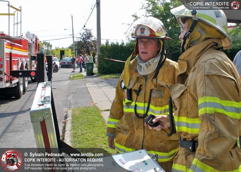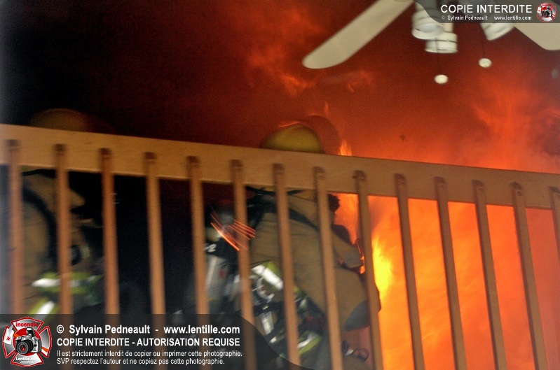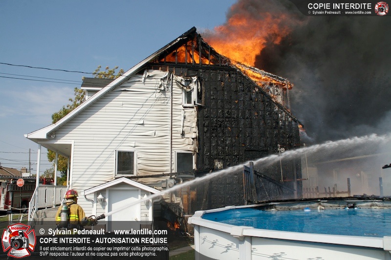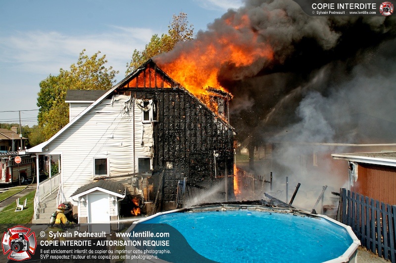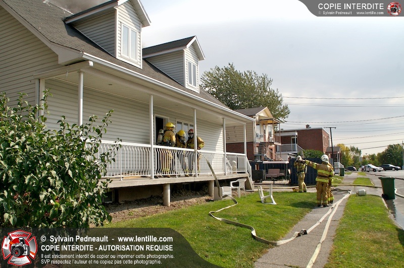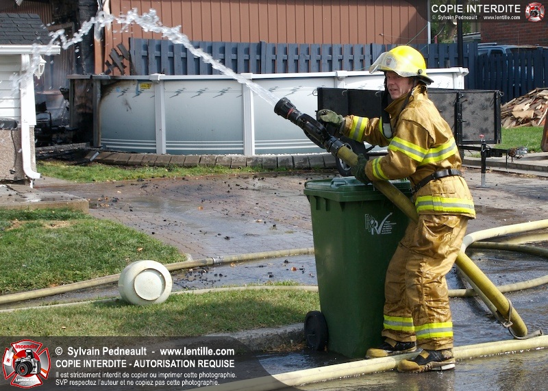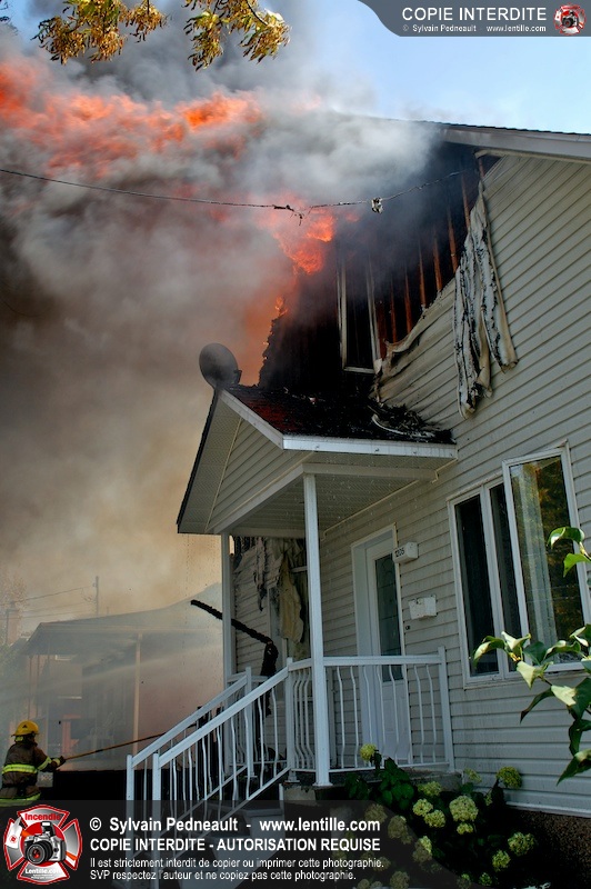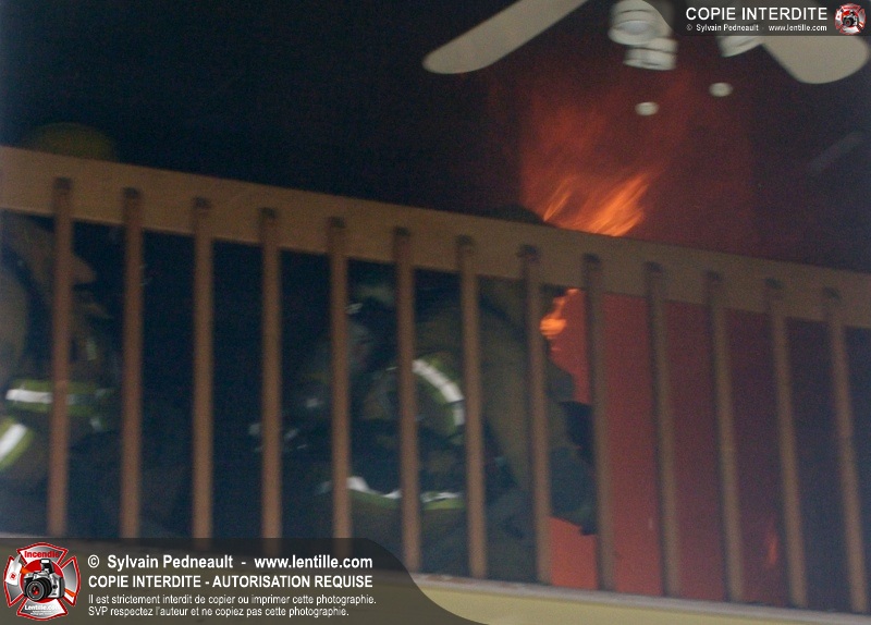 Dès la réception de l'appel pour un feu de résidence, des officiers ont rapporté voir une épaisse colonne de fumée noire dans le ciel, déclarant ainsi l'appel comme fondé. 10-07, 10-12 et 10-13 se sont rapidement succédés étant donné les risques très élevés de propagation à deux bâtiments habités et un garage. Une des maisons était tellement menacée par le brasier que le tout premier jet installé par le 205 fut un jet de protection.