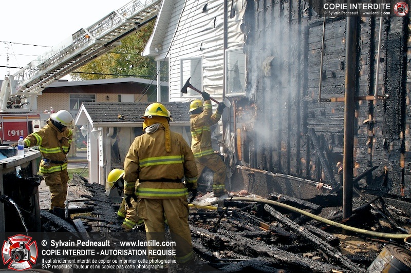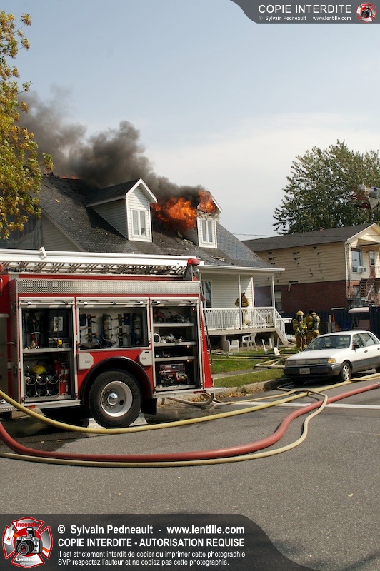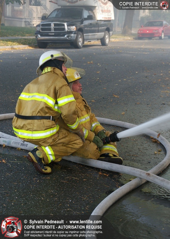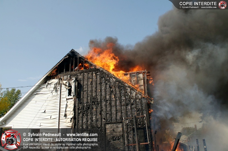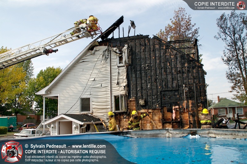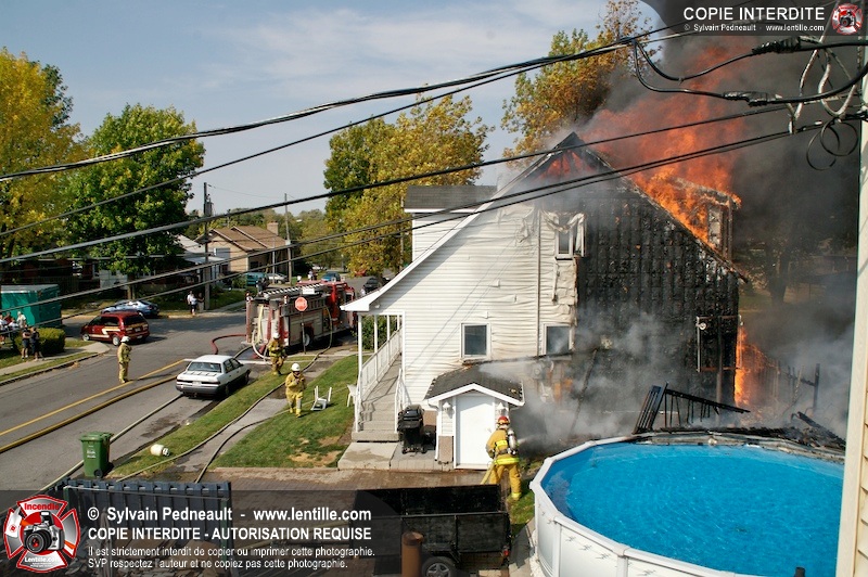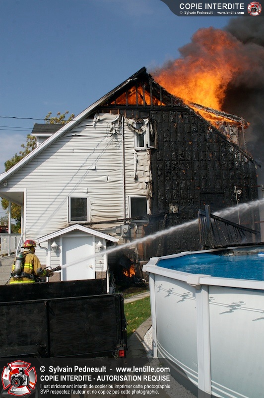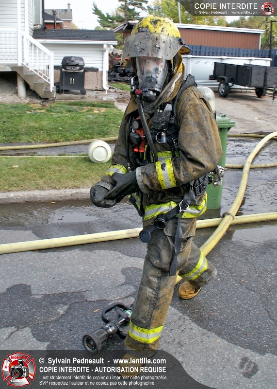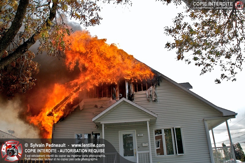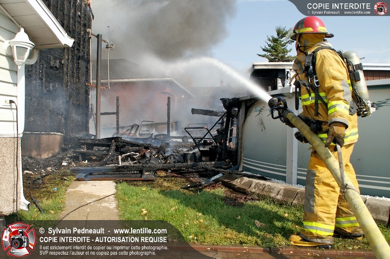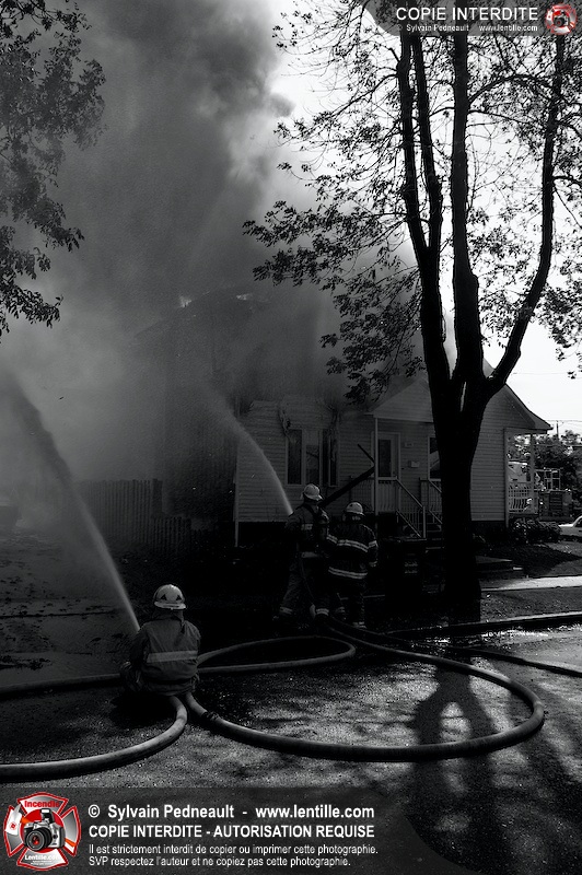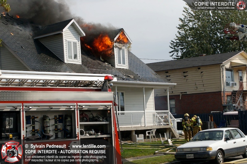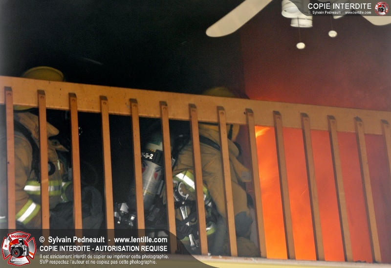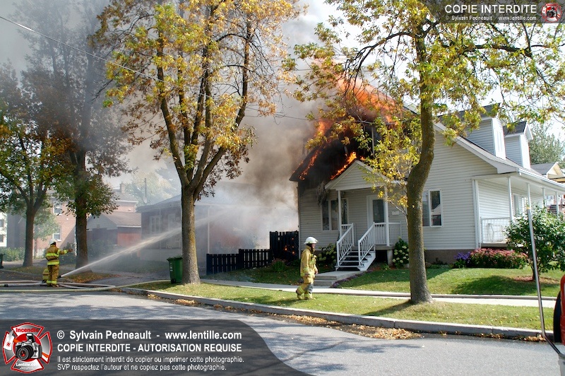 Dès la réception de l'appel pour un feu de résidence, des officiers ont rapporté voir une épaisse colonne de fumée noire dans le ciel, déclarant ainsi l'appel comme fondé. 10-07, 10-12 et 10-13 se sont rapidement succédés étant donné les risques très élevés de propagation à deux bâtiments habités et un garage. Une des maisons était tellement menacée par le brasier que le tout premier jet installé par le 205 fut un jet de protection.
