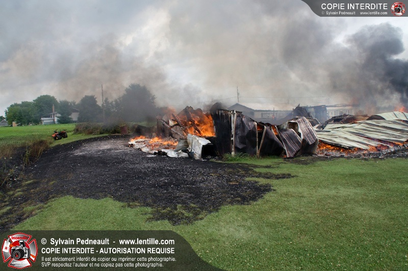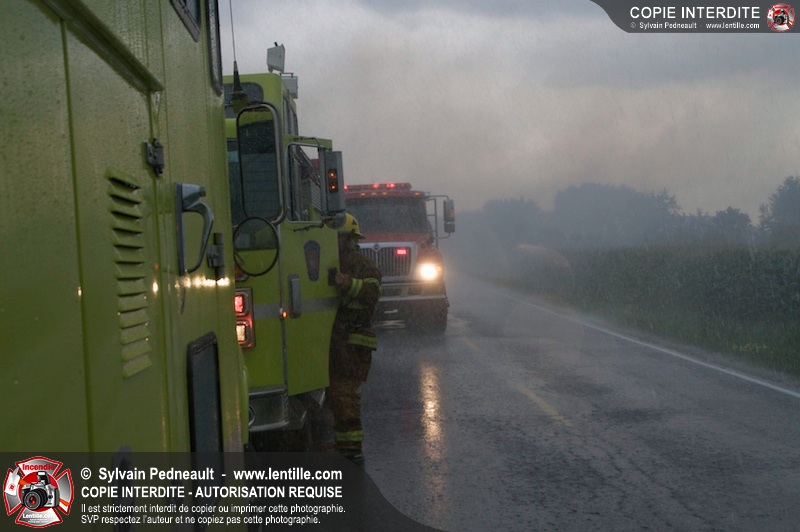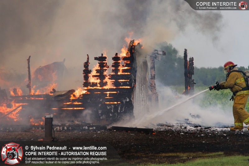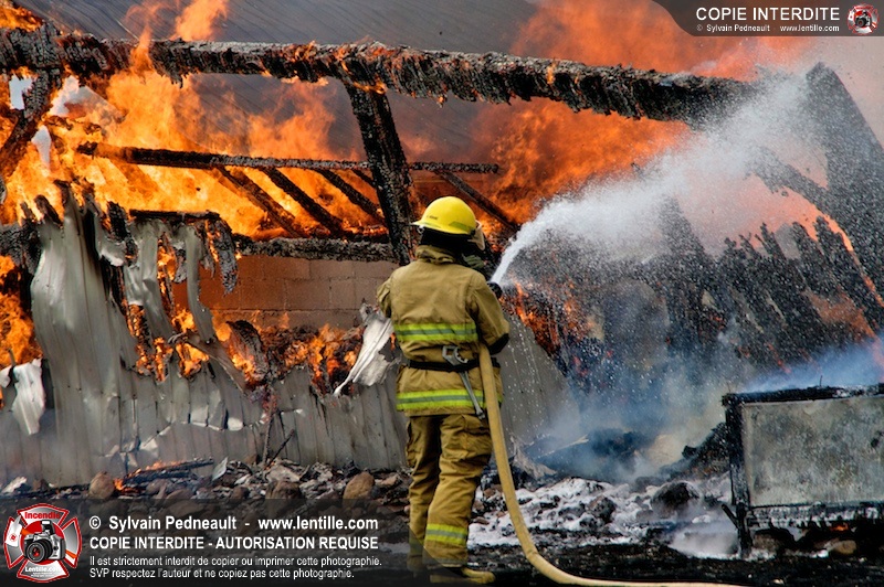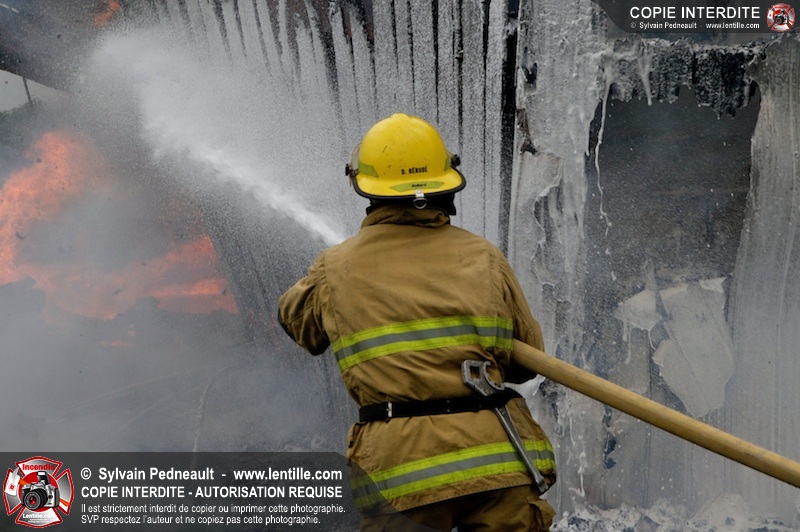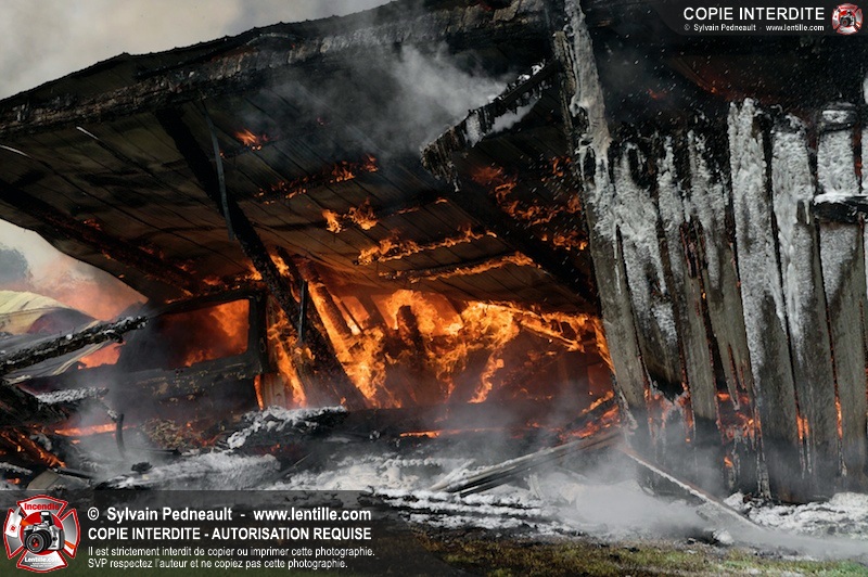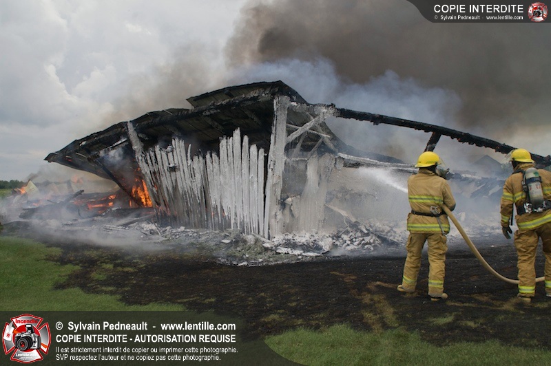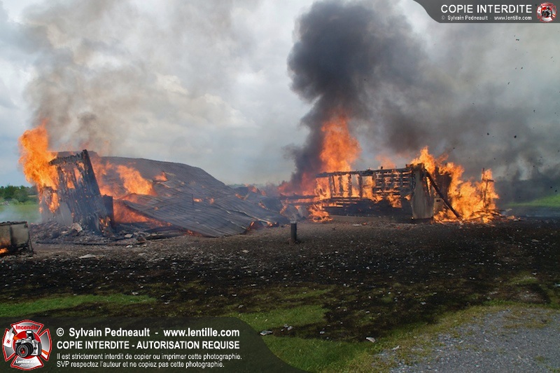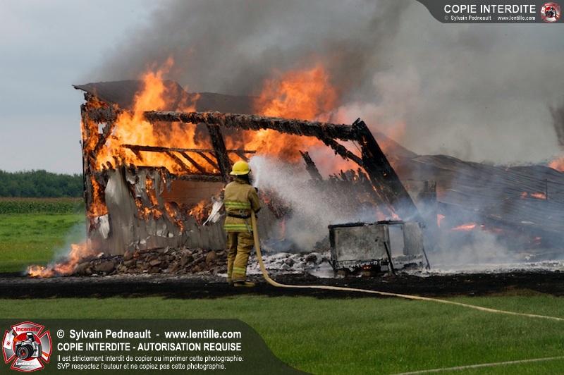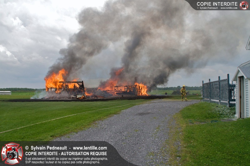 Alors qu'un énorme panache de fumée s'élevait dans le ciel de la Ville, les pompiers de Saint-Hyacinthe convergeaient vers le 5e rang à Ste-Rosalie pour combattre un incendie de grange. À l'arrivée de la première unité, le bâtiment impliqué était embrasé à 100% et menaçait une maison, des véhicules et un garage. Grâce au travail de protection amorcé dès leur arrivée, les pompiers ont pu empêcher la propagation de l'incendie et minimiser les dommages collatéraux.