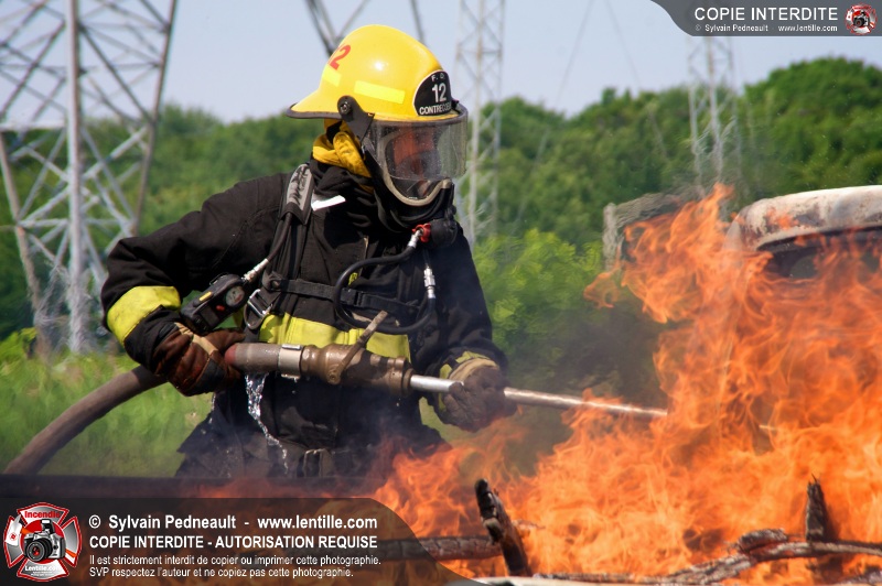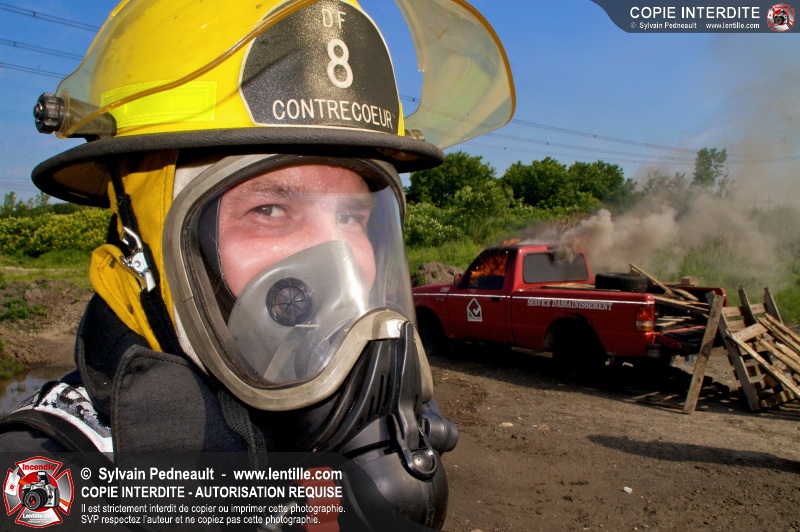 Des pompiers en formation à Contrecoeur ont participé à une pratique d'incendie. Des palettes de bois et un véhicule ont été utilisés pour permettre aux étudiants de pratiquer différentes manoeuvres d'intervention.